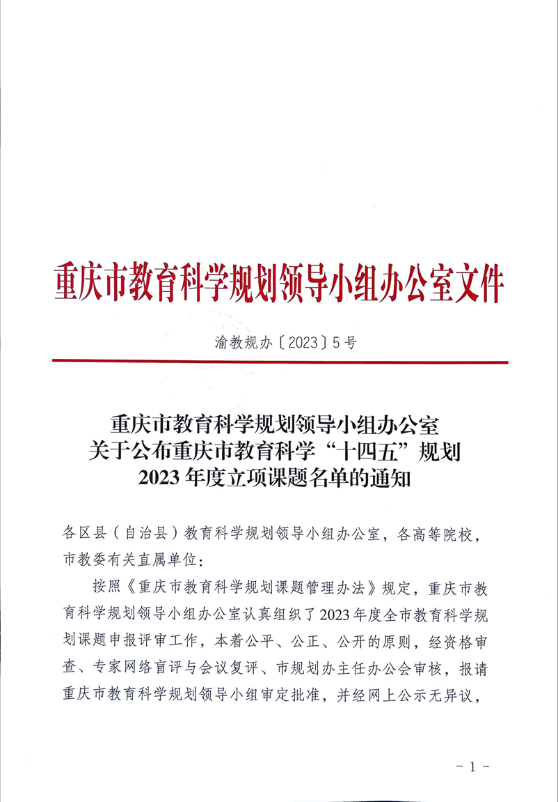 渝教规办(2023)5号  重庆市教育科学规划领导小组办公室关于公布重庆市教育科学“十四五”规划2023年度立项课题名单的通知