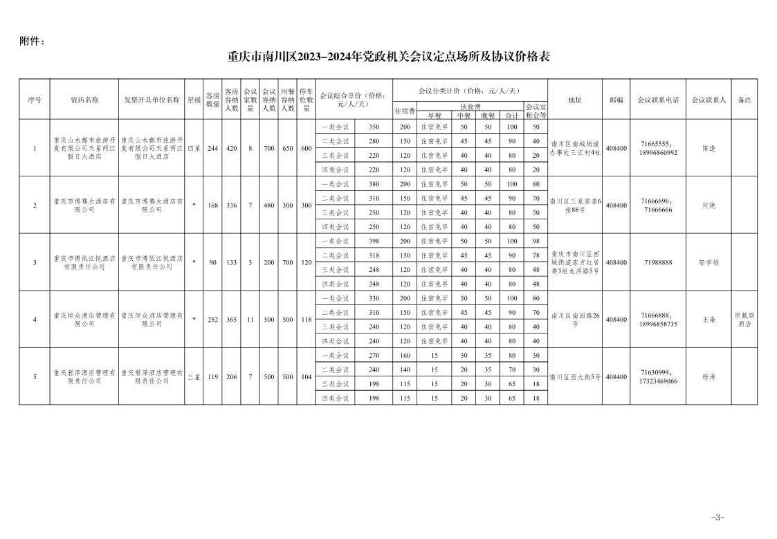 重庆市市级2023-2024年党政机关会议定点场所目录及协议价格表