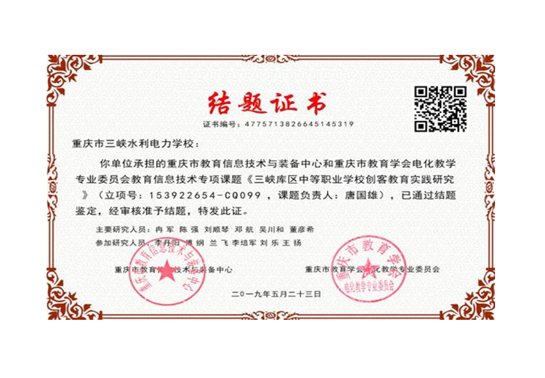 24.重庆市教育信息技术专项课题《三峡库区中等职业学校创客教育实践研究(153922654-CQ099)》结题 作者: 来源: 发布时间:2022年11月19日 点击数: 次 【字体:小 大】 分享到: 【打印正文】