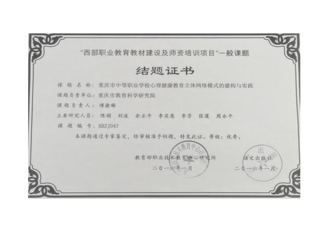 18.教育部职业技术教育中心研究所,“西部职业教育教材及师资培训项目”课题《重庆市中等职业学校心理健康教育立体网络模式的建构与实践(XBZJ047)》结题 作者: 来源: 发布时间:2022年11月19日 点击数: 次 【字体:小 大】 分享到: 【打印正文】