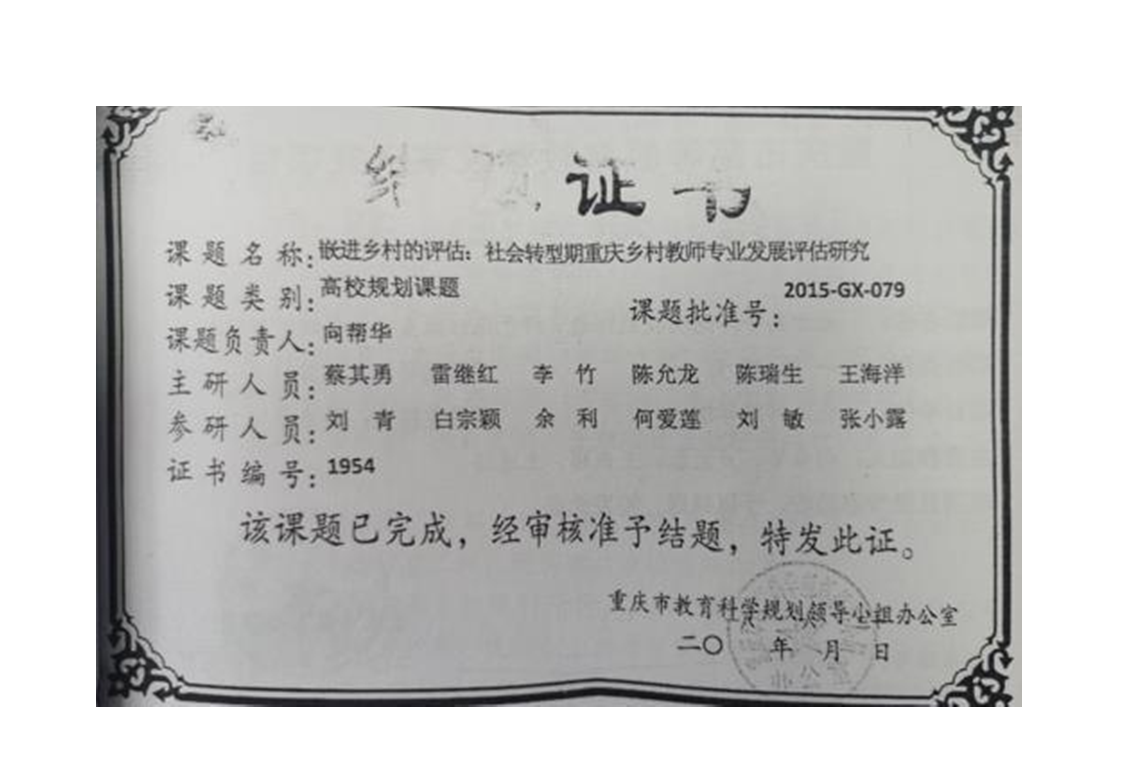 14. 重庆市教育科学规划课题《嵌进乡村的评估:社会转型其重庆乡村教师专业发展评估研究(2015-GX-079)》结题 作者: 来源: 发布时间:2022年11月19日 点击数: 次 【字体:小 大】 分享到: 【打印正文】