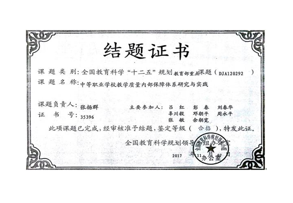 2.全国教育规划教育部重点课题《中等职业学校教学质量内部保障体系研究与实践(DJA120292)》结题 作者: 来源: 发布时间:2022年11月19日 点击数: 次 【字体:小 大】 分享到: 【打印正文】