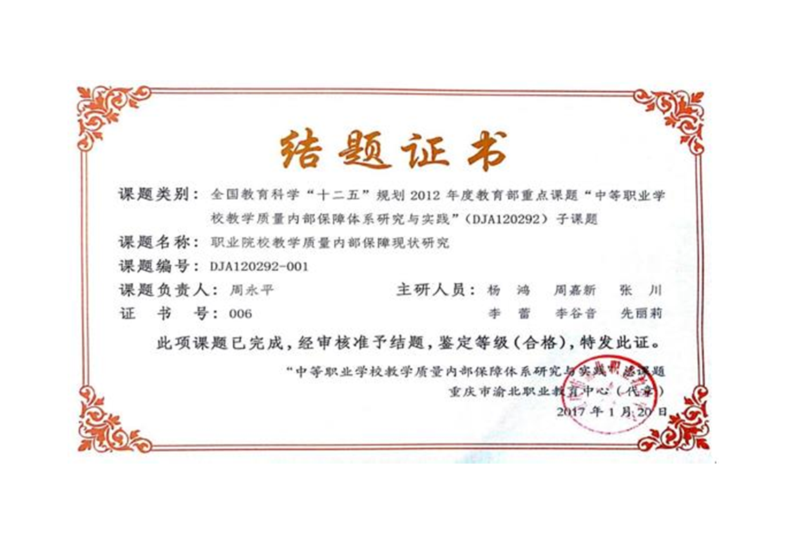 1.全国教育科学“十二五”规划2012年度教育部重点课题《中等职业学校教学质量内部保障体系研究与实践(DJA120292-001)》结题 作者: 来源: 发布时间:2022年11月19日 点击数: 次 【字体:小 大】 分享到: 【打印正文】