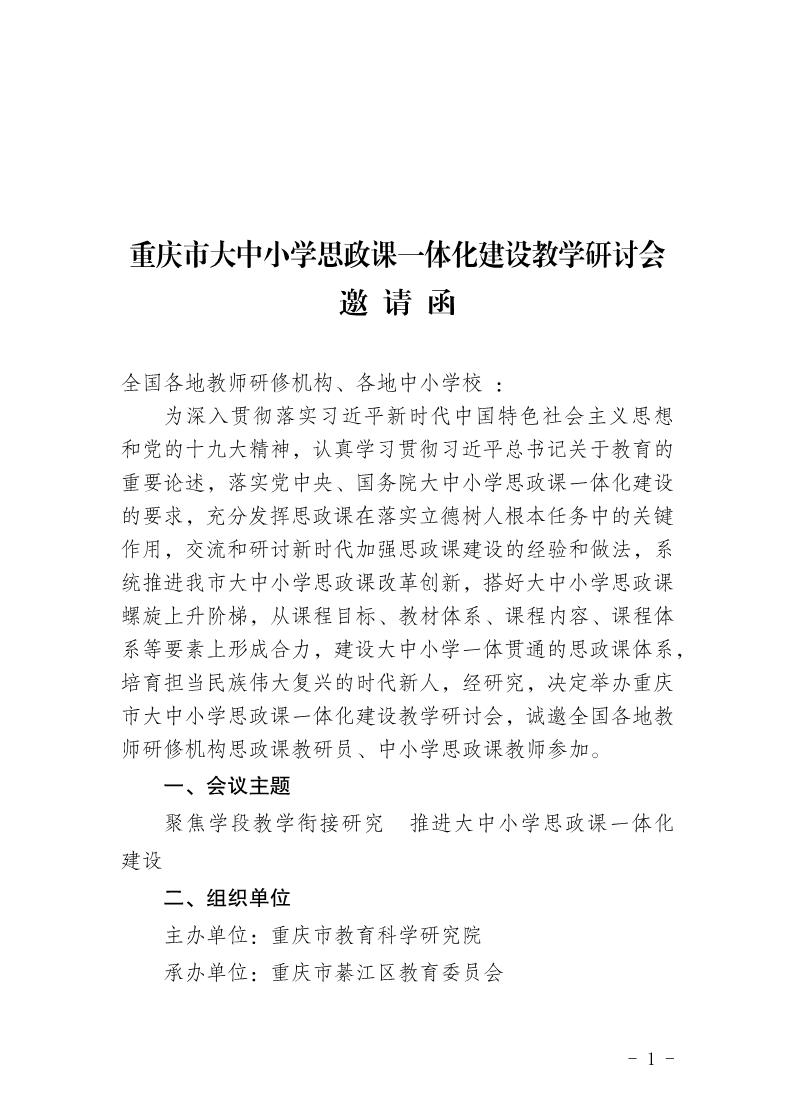 重庆市大中小学思政课一体化建设教学研讨会邀 函