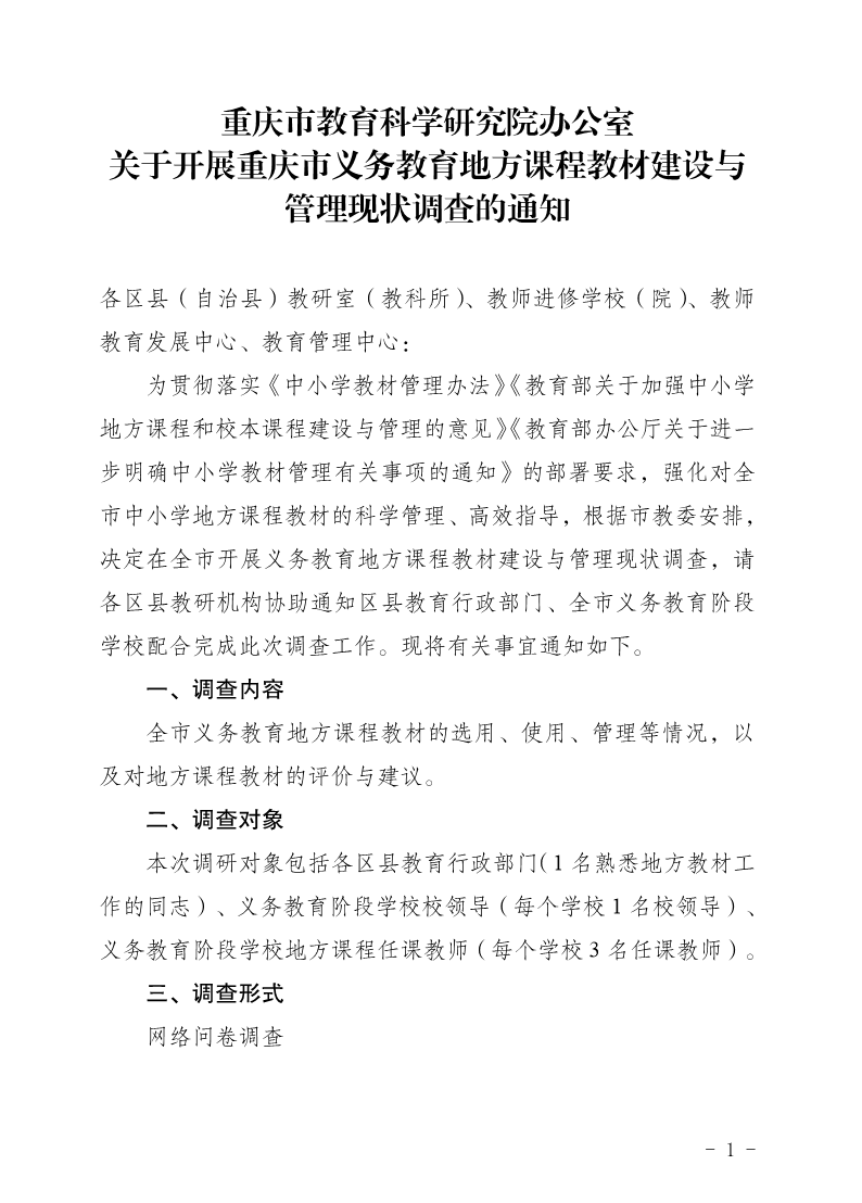 捷克论坛 办公室关于开展重庆市义务教育地方课程教材建设与管理现状调查的通知