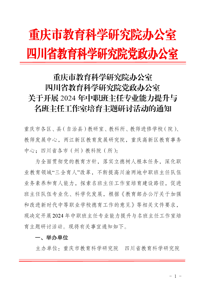 捷克论坛 办公室四川省教育科学研究院党政办公室关于开展2024年中职班主任专业能力提升与名班主任工作室培育主题研讨活动的通知 作者: 来源: 发布时间:2024年03月28日 点击数: 次 【字体:小 大】 分享到: 【打印正文】