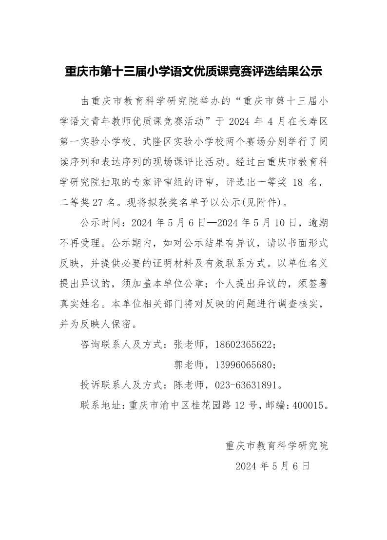 重庆市第十三届小学语文优质课竞赛评选结果公示