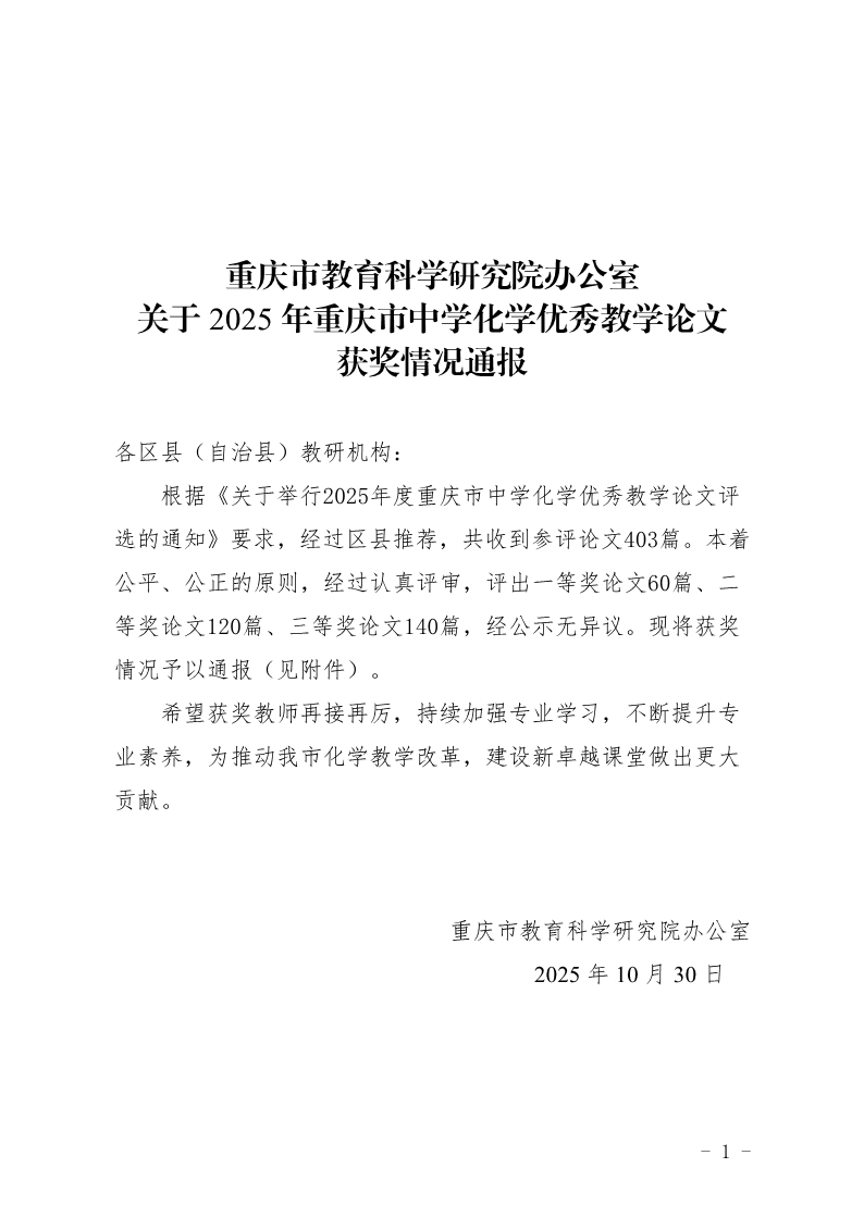 捷克论坛 办公室关于2025年重庆市中学化学优秀教学论文获奖情况通报