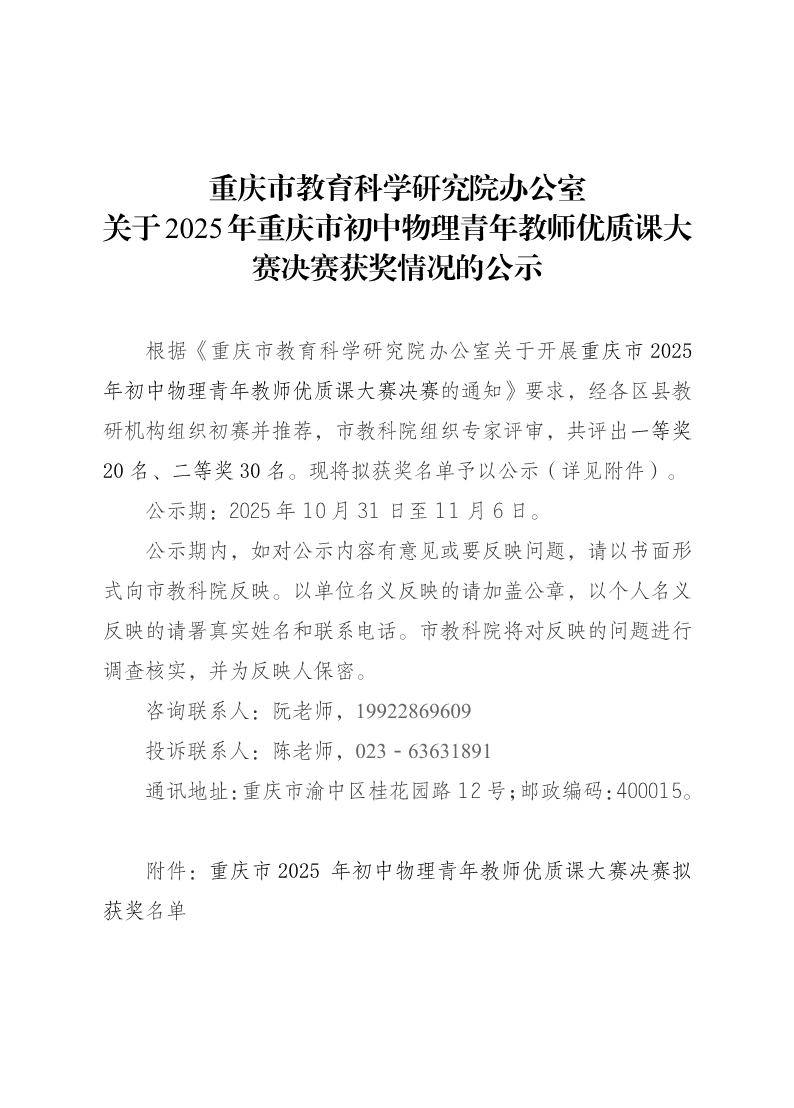 捷克论坛 办公室关于2025年重庆市初中物理青年教师优质课大赛决赛获奖情况的公示