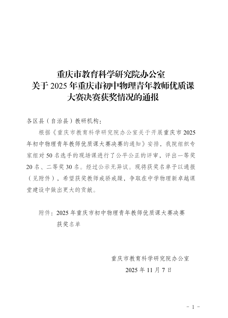 捷克论坛 办公室关于2025年重庆市初中物理青年教师优质课大赛决赛获奖情况的通报
