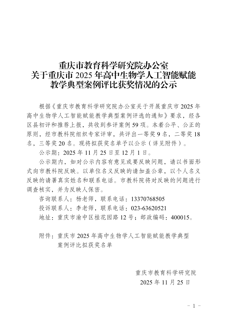 捷克论坛 办公室关于重庆市 2025年高中生物学人工智能赋能教学典型案例评比获奖情况的公示