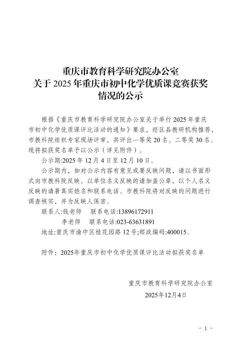 捷克论坛 办公室关于2025年重庆市初中化学优质课竞赛获奖情况的公示