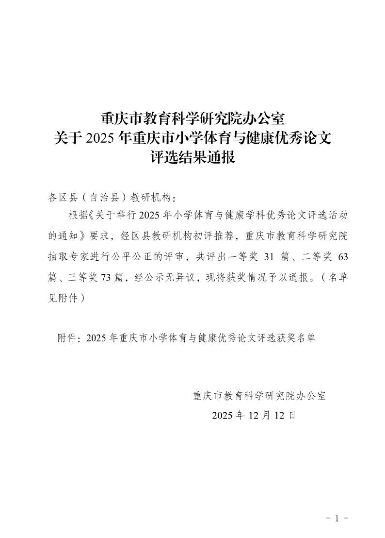 捷克论坛 办公室关于2025年重庆市小学体育与健康优秀论文评选结果通报