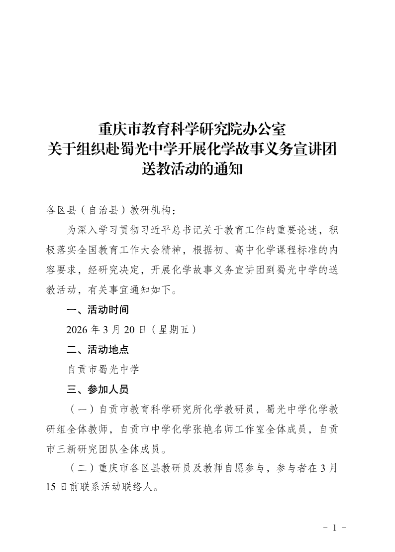 捷克论坛 办公室关于组织赴蜀光中学开展化学故事义务宣讲团送教活动的通知