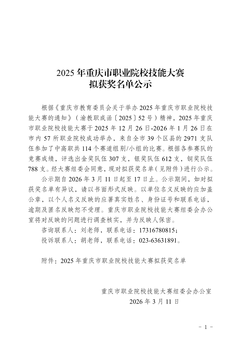 2025年重庆市职业院校技能大赛拟获奖名单公示