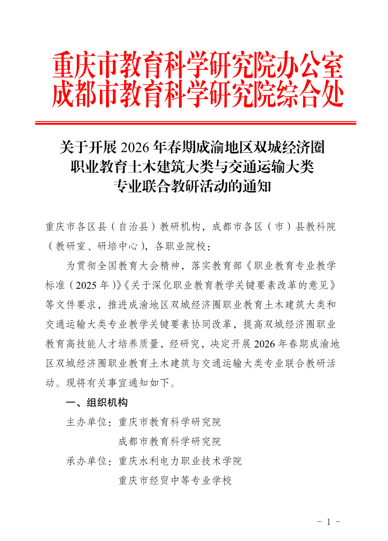 捷克论坛 办公室 成都市教育科学研究院综合处关于开展2026年春期成渝地区双城经济圈职业教育土木建筑大类与交通运输大类专业联合教研活动的通知 作者: 来源: 发布时间:2026年04月10日 点击数: 次 【字体:小 大】 分享到: 【打印正文】