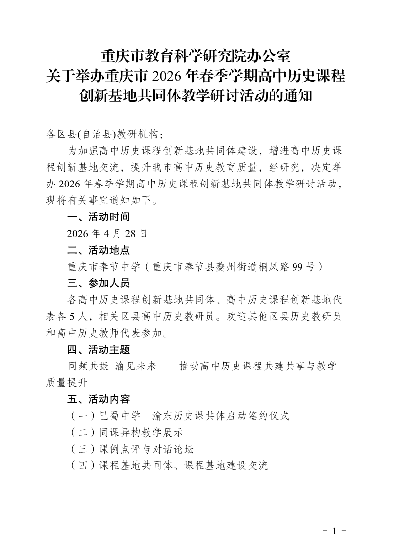 捷克论坛 办公室关于举办重庆市2026年春季学期高中历史课程创新基地共同体教学研讨活动的通知