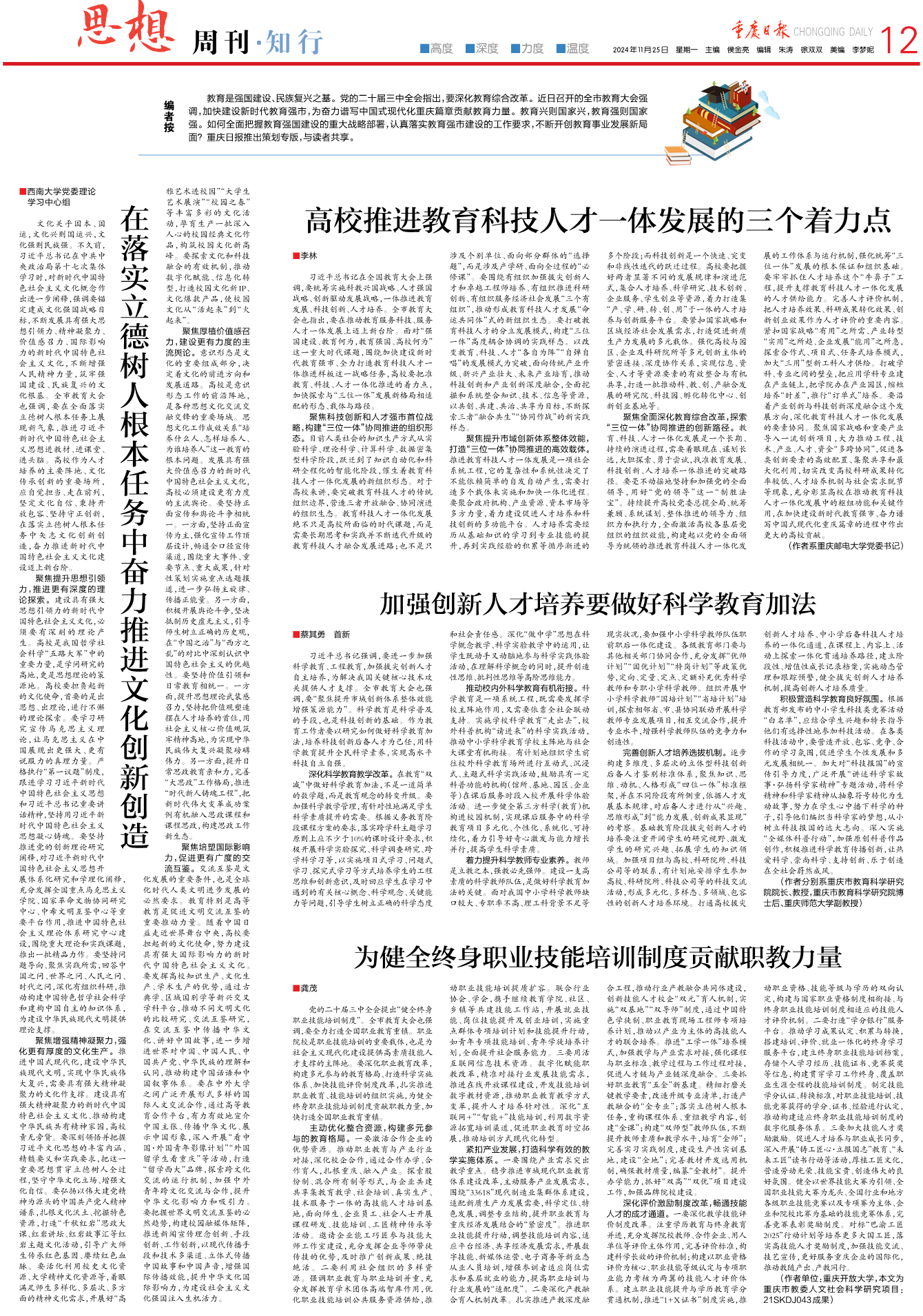 编者按:《重庆日报》电子期刊——思想周刊·知行专题2024年11月25日刊发以捷克论坛 党委副书记、院长蔡其勇署名的笔谈文章《加强创新人才培养要做好科学教育加法》。现将全文转载如下: